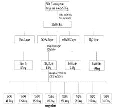 1. 분획물의 제조방법에 있어서, 우묵사스레피(Eurya emarginata)의 잎이 달린 줄기를 준비하고 이를 메탄올로 추출한 다음, 이 추출물의 상층액을 회수하여 감압 농축하고, 증류수로 현탁시켜 우묵사스레피 추출물을 제조하는 제1공정, 제1공정에서 제조한 우묵사스레피 추출물을 용매인 헥산, 에틸아세테이트, 부탄올, 물로 순차 추출하여 분획물을 제조하는 제2공정, 상기 제2공정에서 제조한 분획물 중 에틸아세테이트 분획물을 선택하는 제3공정, 제3공정의 에틸아세테이트 분획물을 다시 전개용매인 헥산, 디클로로메탄, 에틸아세테이트, 메탄올로 분획하여 분획물을 제조한 후, 이 중 디클로로메탄 분획물을 선택하는 제4공정으로 구성된, 렌자이올론 성분을 함유하는 우묵사스레피의 추출분획물의 제조방법. |