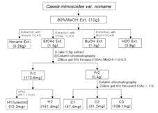 본 발명은 차풀(Cassia mimosoides var. nomame)추출물의 제조방법 및 차풀 추출물을 유효성분으로 함유하는 피부노화방지 및 피부주름방지용 화장료조성물에 관한 것이다. 차풀 추출물에는 항산화물질인 화학식 1로 표시되는 루테오린 화합물을 포함하고 있으며, 이 루테오린 화합물이 항산화 및 항주름 효능을 포함한 피부노화방지효과를 나타낸다. 또한, 본 발명은 차풀 추출물로부터 루테오린의 분리·정제방법을 제공한다. 본 발명의 차풀 추출물에 함유되어 있는 루테오린화합물은 엘라스타아제 저해작용, mmp-1 저해작용, 라디칼 포착형 항산화작용등을 갖고 있다. |