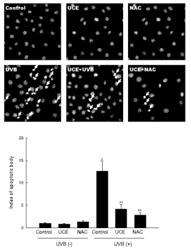 본 발명은 다실미역(Undaria crenata)의 알코올 추출물을 포함하는 자외선에 의한 인간 피부각질세포의 세포사멸 억제용 조성물에 관한 것으로, 다실미역의 추출물이 인간 HaCaT 피부각질세포에서 UV 유발 세포 손상에 대한 광보호 효과, 과산화수소와 UV에 의해 유도된 세포내 활성산소종에 대한 소거 활성을 나타냄으로써 자외선 유도 세포사멸을 감소하고, 세포 생존력을 회복시킨다. |