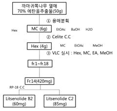 본 발명은 까마귀쪽나무 미성숙과 추출물 또는 이로부터 분리된 화합물을 이용한 항염증용 조성물에 관한 것으로, 구체적으로는 NO 생성 억제 활성, PGE2의 생성 억제 활성 및 염증성 사이토카인의 생성 억제 활성을 가지는 까마귀쪽나무 미성숙과 추출물 및 이로부터 분리된 화합물인 리트세놀라이드 B2(Litsenolide B2) 및 리트세놀라이드 C2(Litsenolide C2)를 이용한 항염증용 조성물을 개시한다. |